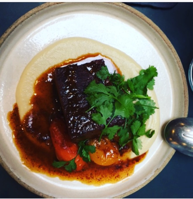 We were a table of four so we ordered lots of dishes to share. We had Yemeni homemade bread with tahini, a tomato dip, burnt courgette tzatziki, chillies and pickles. You’ve never seen bread disappear so quickly. Next up were the beetroot carpaccio and fattoush salad followed by deconstructed kebab, ironed chicken thighs, pork belly and gnocchi.