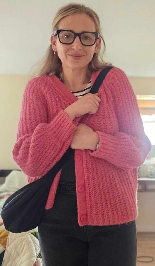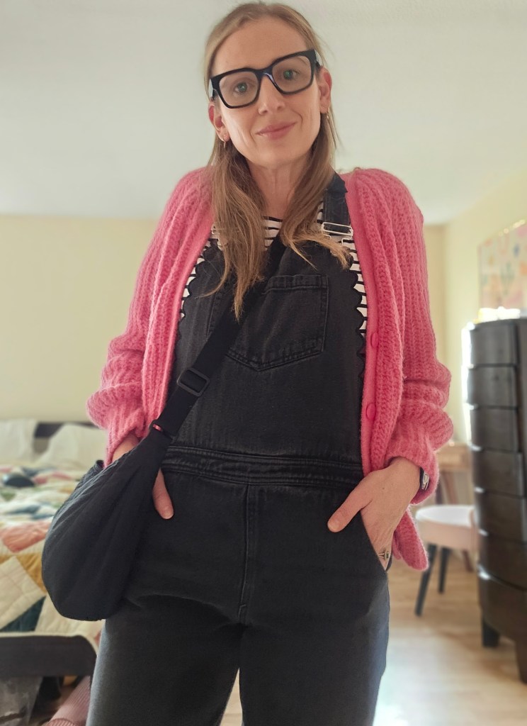 Aside from the nursery run, I’ve been at home writing today. I’m wearing an outfit I wear all the time. I love wearing dungarees with an oversized cardigan and a quirky accessory. It makes me feel like me.