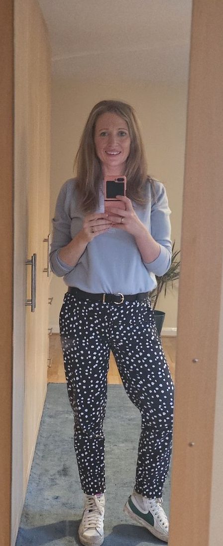 Blue sky jumper, M&S x Bella Freud; trousers, Reiss; trainers, Nike; belt, Accessorize.