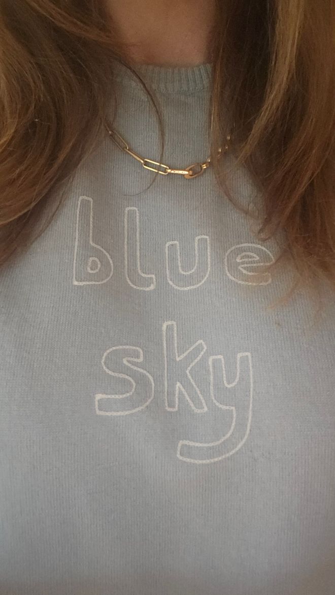 I thought about him this morning as I pulled on my jumper that said Blue sky. I chose it because it’s 100% merino wool, which is excellent for regulating my temperature as I oscillate between feeling the autumnal nip and wiping my peri-menopausal brow (it’s also sustainable, thank you very much). It made a bold declaration that the sky was blue, when in actual fact it was grey and about to pour. Perhaps people might pack away their waterproofs when they see me?